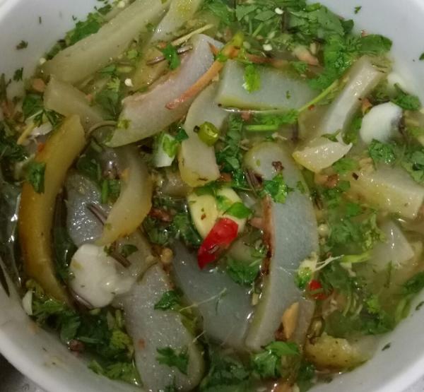 Anh Tòng Văn Yên, bản Pảng, xã Chiềng Đen,thành phố Sơn La, tỉnh Sơn La cho biết thêm: "Da trâu cắt thành miếng bằng bàn tay, nhúng nước nóng cạo sạch, sau đó nướng trên bếp than đến khi thơm phức, rồi rửa sạch khi miếng da trâu vàng ươm là được. Cho vào nồi rồi luộc khi thấy miếng da mềm là được, nếu luộc nhừ quá thì da sẽ không giòn ngon".